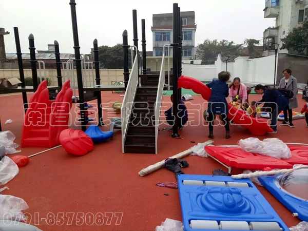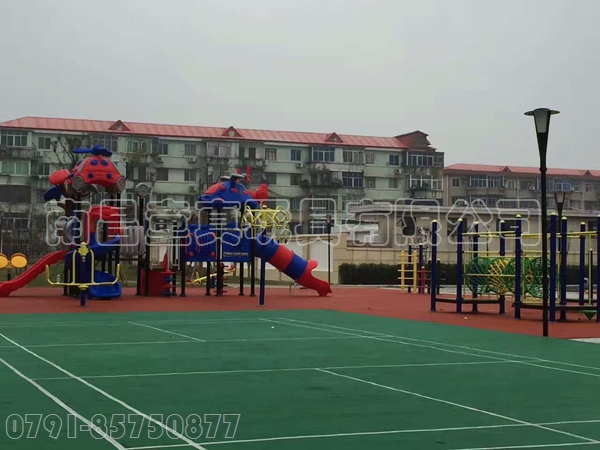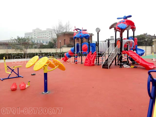 配套设备:1.组合滑梯 2.户外健身器材 3. 体能拓展设备 4. 塑胶地垫 5.儿童跷跷板 6.儿童摇马